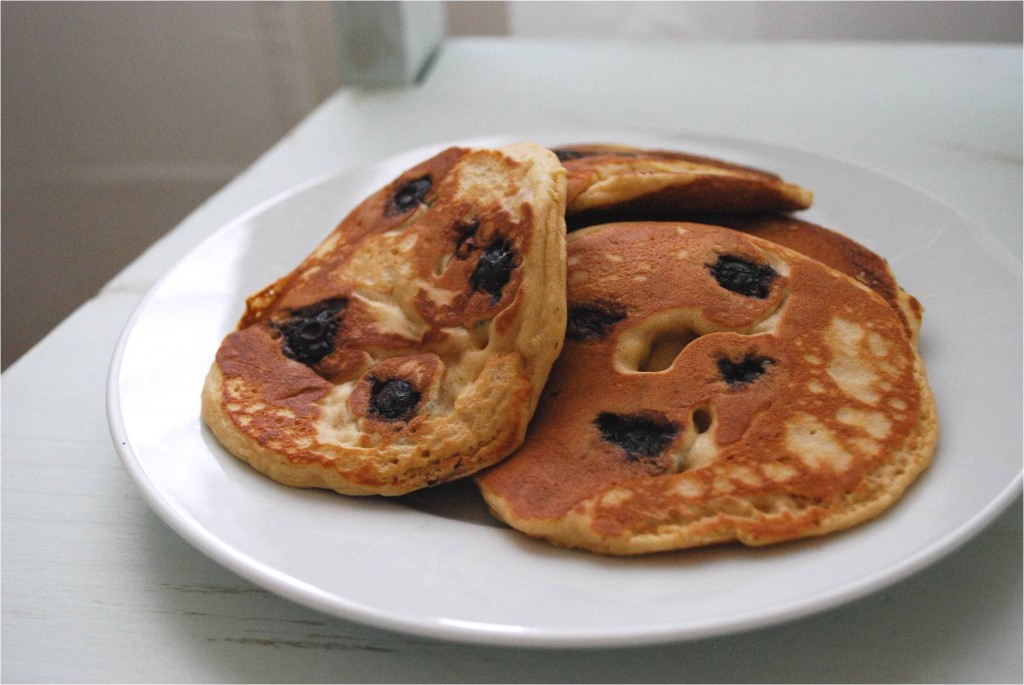 I am not sure where it originated, but it has withstood the test of time and hungry stomachs. Over the years with our changing tastes there have been additions of: chocolate chips during the sweet-tooth childhood, strawberries during Sunday Wimbledon watch parties, and banana-chocolate chip- pecan for Elvis inspired creations via Austin, TX. Today, my freezer was stocked with frozen blueberries, so they were my mix-in of choice.